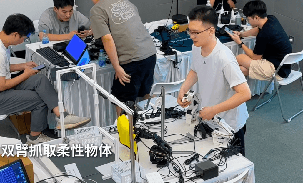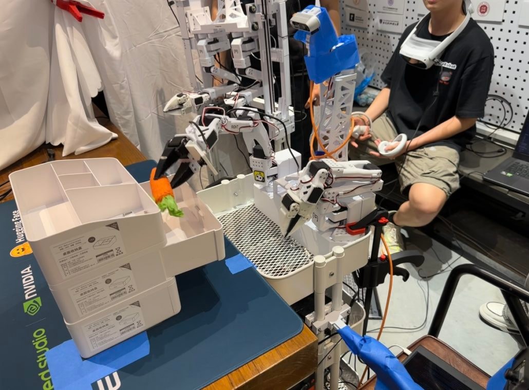 The final demo showcased dual-robot collaboration: Make XLeRobot handled hand-to-hand object passing, while the base-spec XLeRobot ran a VLA (Vision-Language-Action) model to autonomously pick up and store objects. Together, the two robots highlighted how coordinated embodied AI systems can handle complex, multi-step tasks with precision and fluidity.