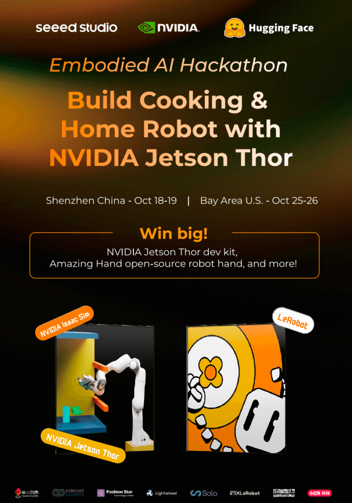 Initiated by Seeed Studio, NVIDIA, and Hugging Face, we’ve successfully hosted two Embodied AI Hackathons during the past October in 2025 – across Shenzhen, China + Mountain View, U.S. Over 700 developers registered, and more than 30 teams came together to build and contribute to this open-source robotics playground!