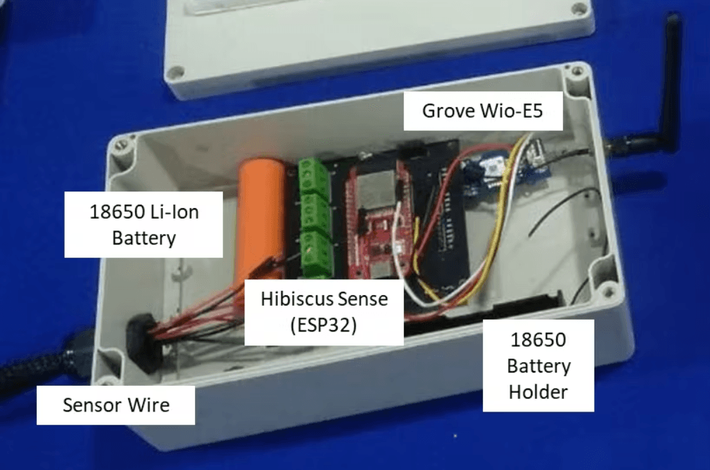 This DIY LoRa® sensor node serves as the LoRa® sender. The White Box contains The Wio-E5 + ESP32 Development Board: Grove Wio-E5 and Hibiscus Sense (ESP32), while the Black Box contains 3 types of sensors: