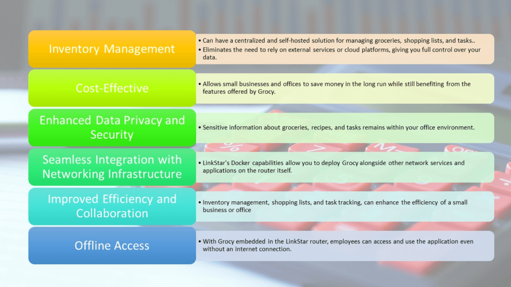 Embedding Grocy in a LinkStar router with Docker capabilities can offer several advantages for a small business or office environment.
