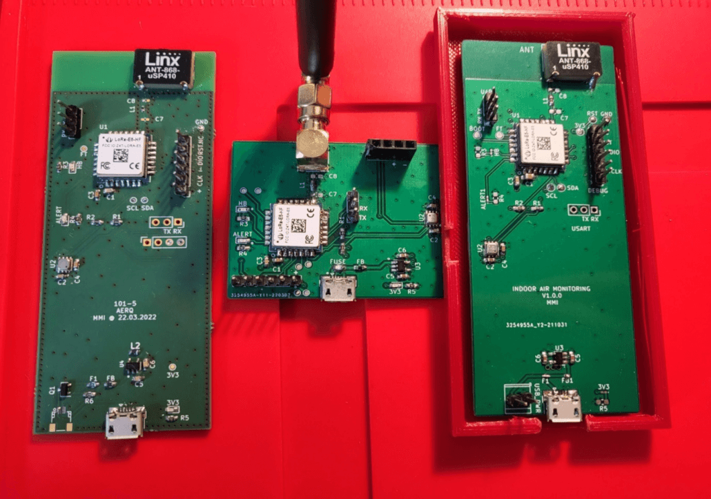 This projects uses an STM32WL – Seeed Wio E5- for the brains and a Bosch BME688 to get the IAQ, using the BSEC 2.x library. A version with an integrated antenna and one with an SMA connector. All boards feature a 4-layer custom board.