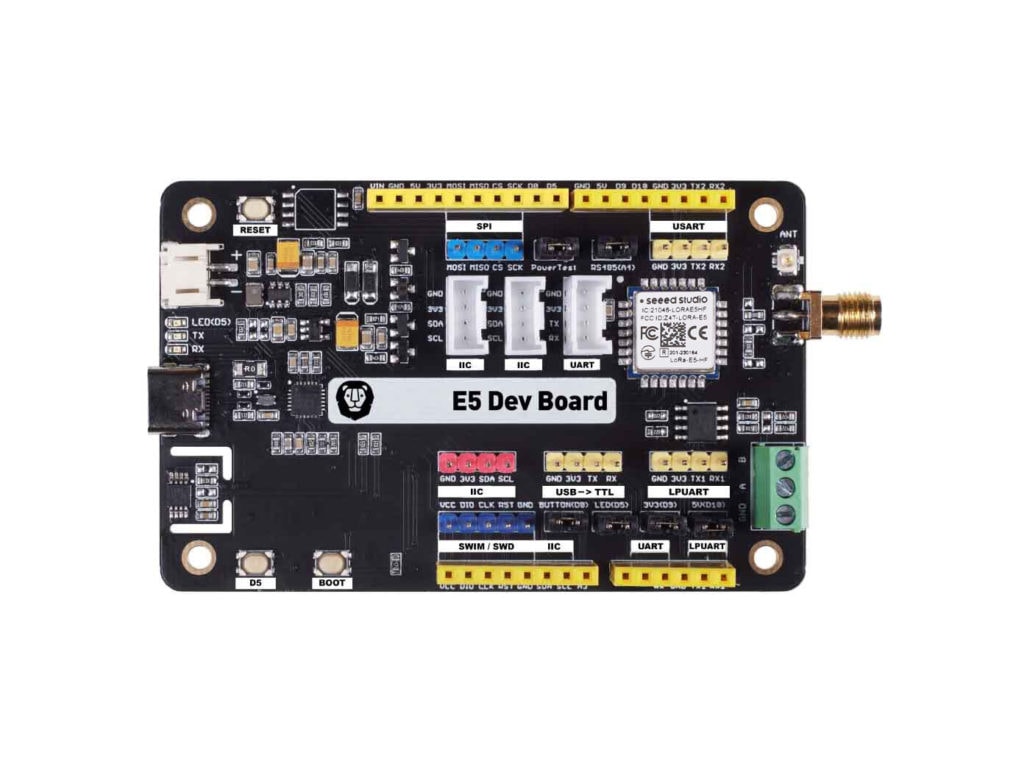 The Wio-E5-LE mini Dev Board integrates and provides access to the full GPIO capabilities of the Wio-E5-LE Wireless Module (STM32WLE5JC). With support for long range protocols and global frequencies, the Wio-E5-LE mini can achieve a transmission range up to 10km in open areas. It supports EU868 and US915, making it well-suited for wireless sensor networks and other IoT devices requiring battery power, low power consumption, and long range connectivity.