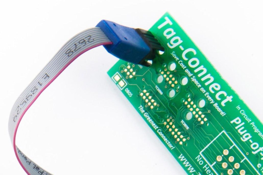 There are many ways to accomplish this in-system connection and one of my favorites is using the Tag-Connect system. This eliminates the need for extra components on the board. I have a few of these special cables laying around which I can use to connect to all my boards because I use the same Tag-Connect footprint on all my designs.
