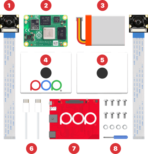 These include stabilization, wifi and cellular control, cloud storage, audio support, GPS location, live streaming, a free POP account and free software updates. The kit includes: (1) two cameras, (2) a Raspberry Pi CM4 module (3) battery, (4 & 5) a front and back case, (6) a USB-C cable, (7) POP module (made by Seeed!) and (8) assembly mounts.