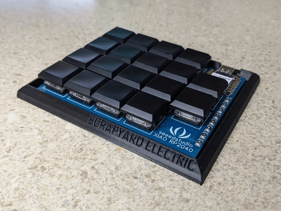 A minimalist 18 key numpad created by Scrapyard by using the Seeed Studio XIAO RP2040, a single analogue pin, and room for expansion!