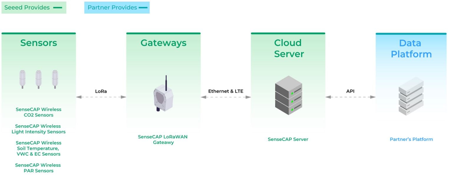 With the farmers’ feedback, the Project deployed SenseCAP sensors and a gateway in the greenhouse, and the following environmental data was collected and monitored in real-time: CO2, light intensity, soil temperature, soil moisture (VWC), soil electrical conductivity (EC), and photosynthetically active radiation (PAR). These sensors’ data was collected by LoRaWAN sensor nodes, and then sent to the SenseCAP Cloud Server through the LoRaWAN gateway. Then, the integrated data was displayed on our partner’s data platform (Figure 5).