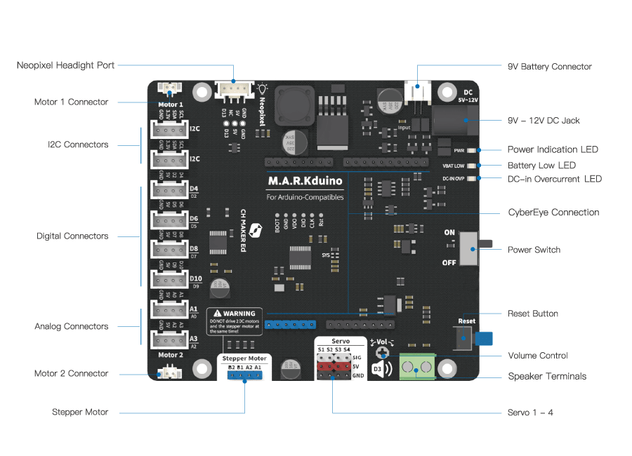 Included are stepper motor & spare servo ports which you could utilize to extend MARK as a robot with a grabber or conveyor functionality. The Markduino also includes spare Digital, Analog, and I2C ports, into which you can easily plug & play some compatible Grove series sensors. Read more about grove here. Those familiar with Arduinos will notice that the markduino pinout fits, so projects can be implemented with this controller too.