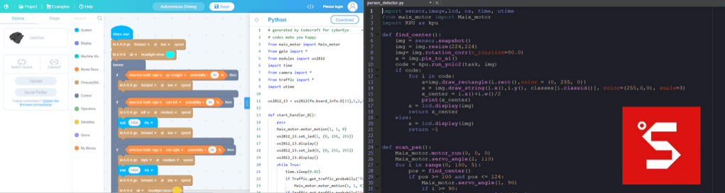 MaixPyIDE from SIPEED - More advanced users can choose to directly write code for MARK using MaixPyIDE. The cyberEYE mainboard's K210 chip has Microython firmware which features openMV support.