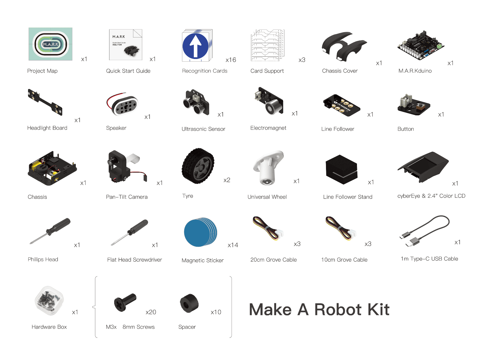 For a Hands-on construction experience, MARK will come disassembled in parts with the tools you need to make your robot. But don't worry! The kit has abundant documentation, including a step-by-step assembly guide with video instructions.