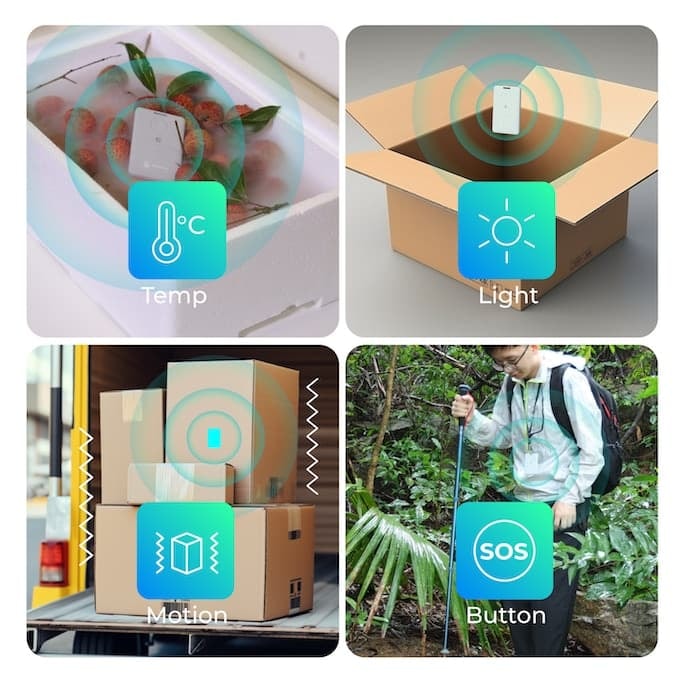 The temperature sensor is ideal for monitoring temperature-sensitive goods like food, and the light sensor detects unpacking activities. This data can be utilized for compliance verification.