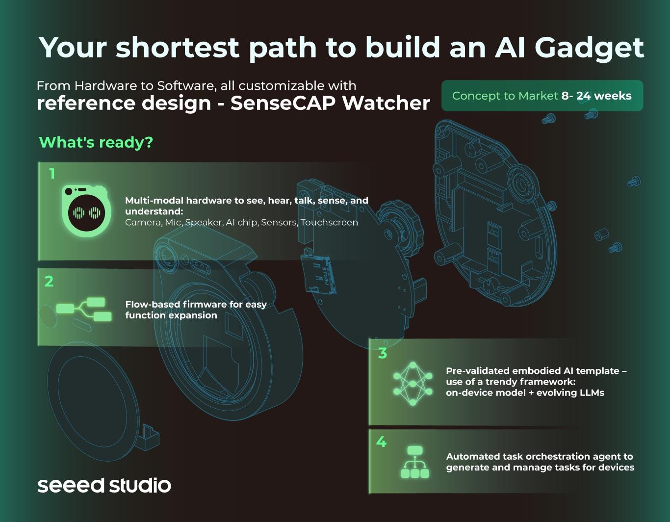 With SenseCAP Watcher, we've developed a revolutionary framework that brings powerful LLMs to the very edge of the physical world. This framework speeds up AI hardware prototyping. With our customization services, you can bring your AI hardware to life faster than ever before!