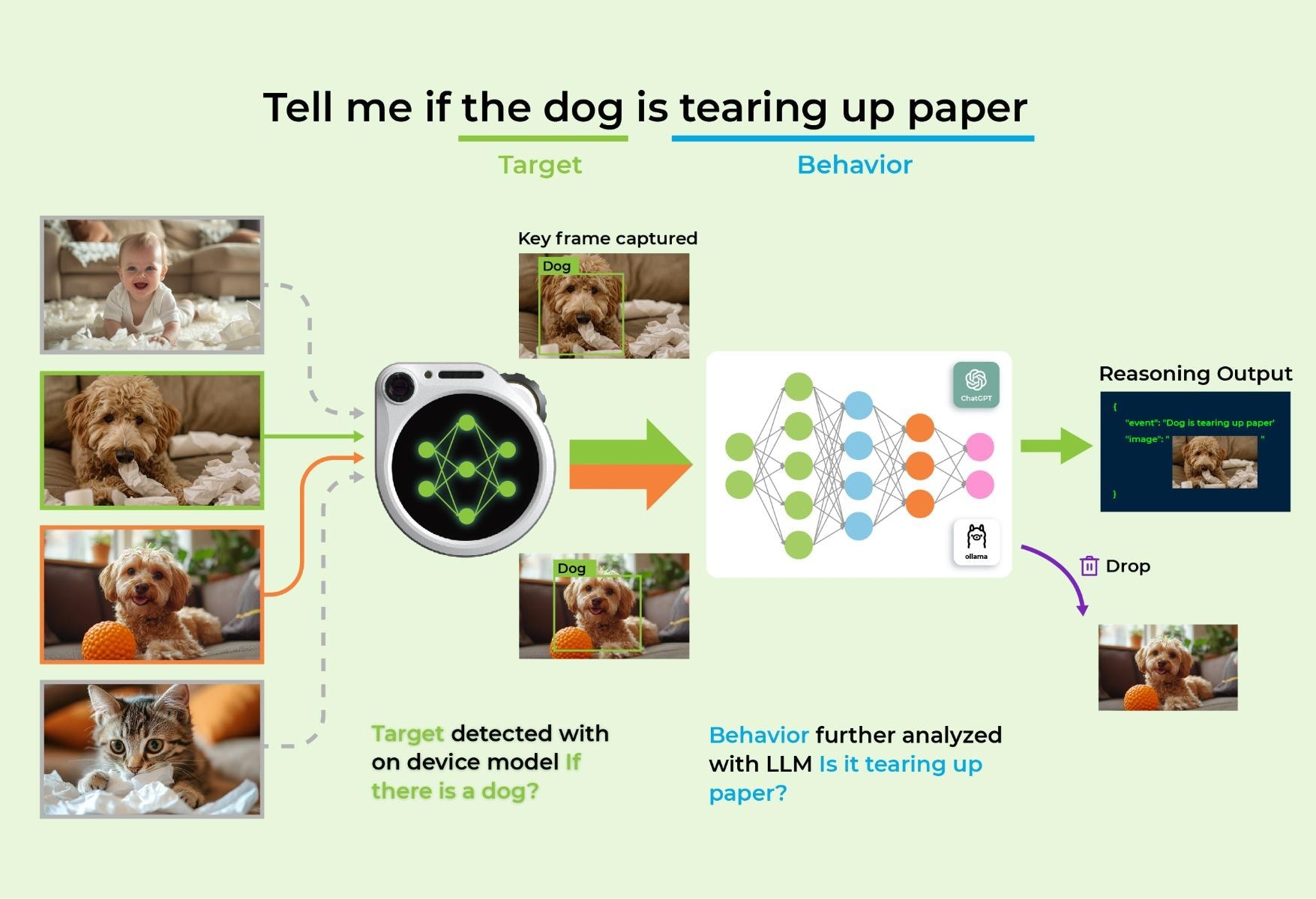 With the task "tell me if the dog is tearing up paper" when the on-device model detects dogs, this keyframe is sent to LLM for further analysis - is it tearing up paper? LLMs won't be triggered by people, cats, squirrel or others. This tremendously reduces LLMs' cost.