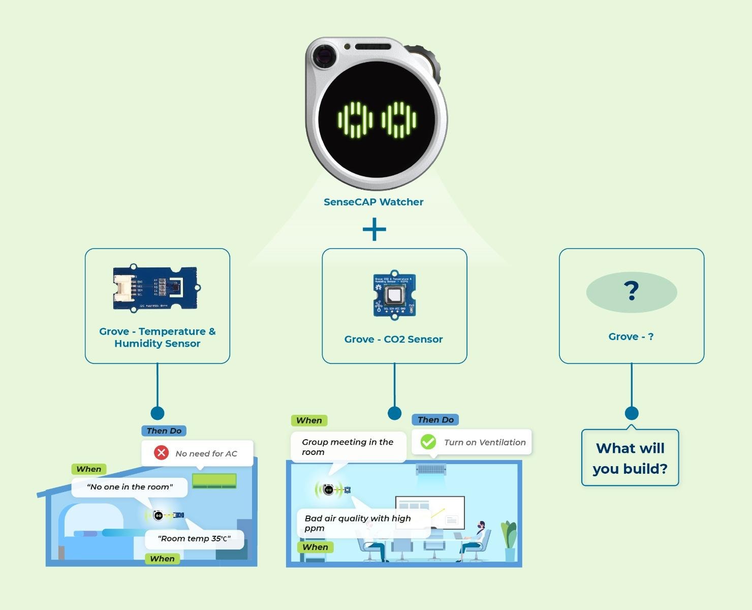 More than a vision sensor, Watcher is extendable with other sensors to enable multi-modal sensing. On Watcher's back, the I2C is reserved to accommodate 100+ Grove sensors. This flexibility allows Watcher to integrate a wide range of data sources for thorough analysis and appropriate actions. You will be able to build applications like detect room temperature and adjust the AC accordingly - turn it to 22°C when you're in suits, or 26°C in shorts.
