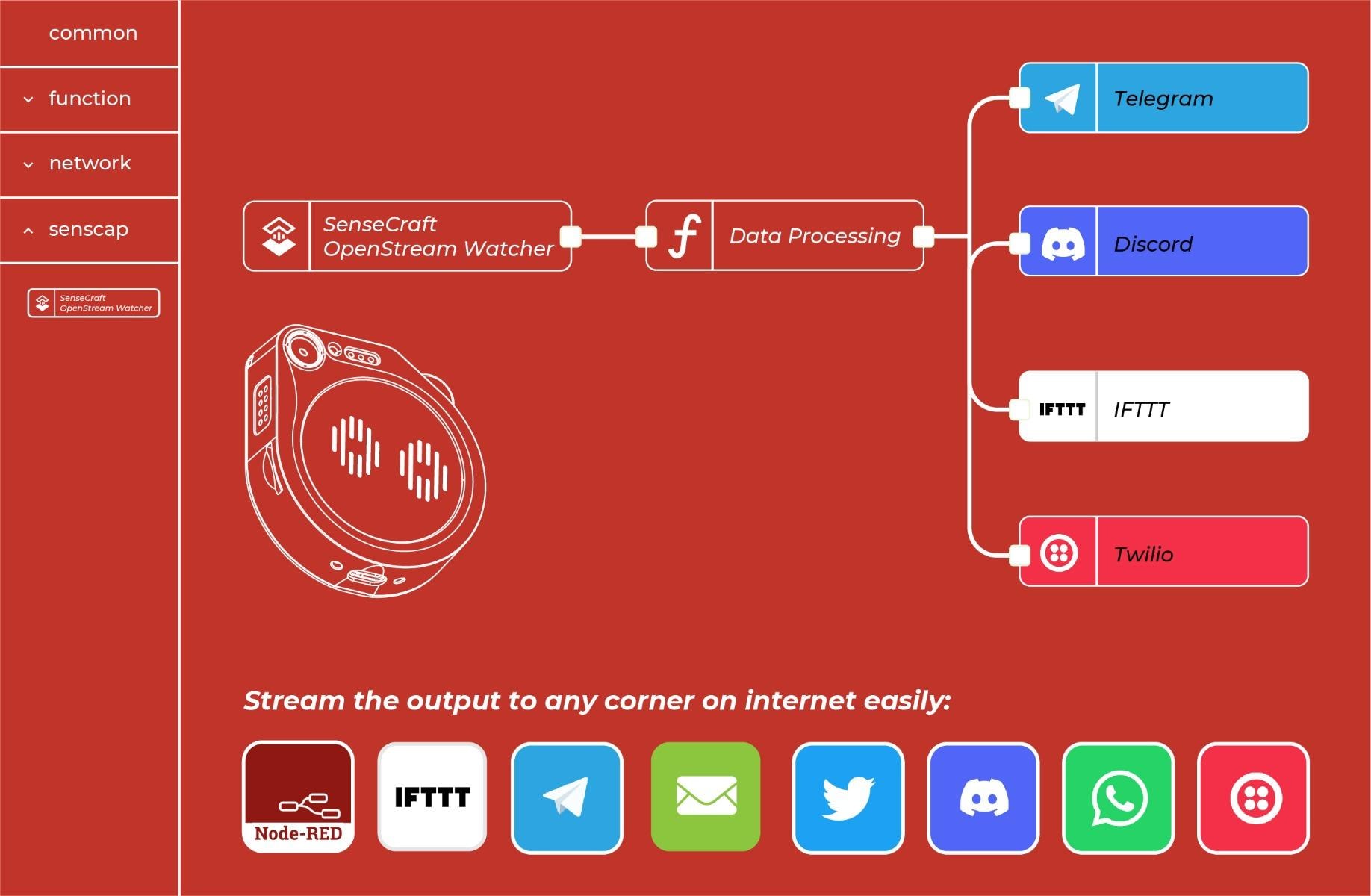Just 3 blocks away, you can stream the detected results from your Watcher to any place on the internet via Node-RED, as easy as making a snap!