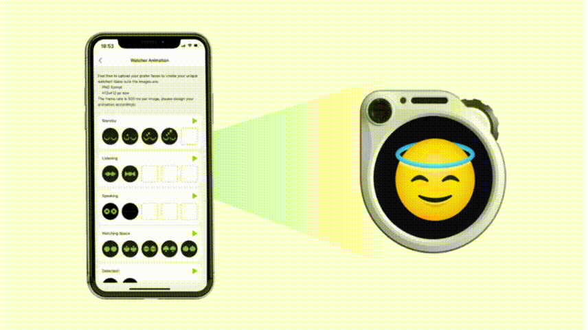 SenseCAP Watcher adapts to your commands with unique "modes." It is LISTENING to your instructions, then shifts to WATCHING mode to safeguard your designated space, etc. But the fun doesn't stop here! You can upload your own designs of emotions to give your Watcher a unique personality. Get a PNG file ready and upload it to Watcher within seconds! It is your call!